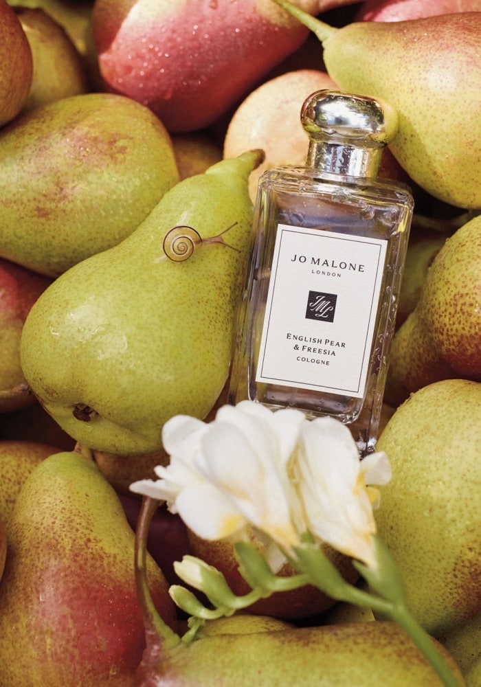 Boomgaarden badend in gouden zonnestralen die de roodbruine rondingen van sappige peren verwarmen. De sensuele frisheid van net rijpe vruchten, omhuld door elegante witte fresia's, versterkt met roos en geworteld in patchoeli.